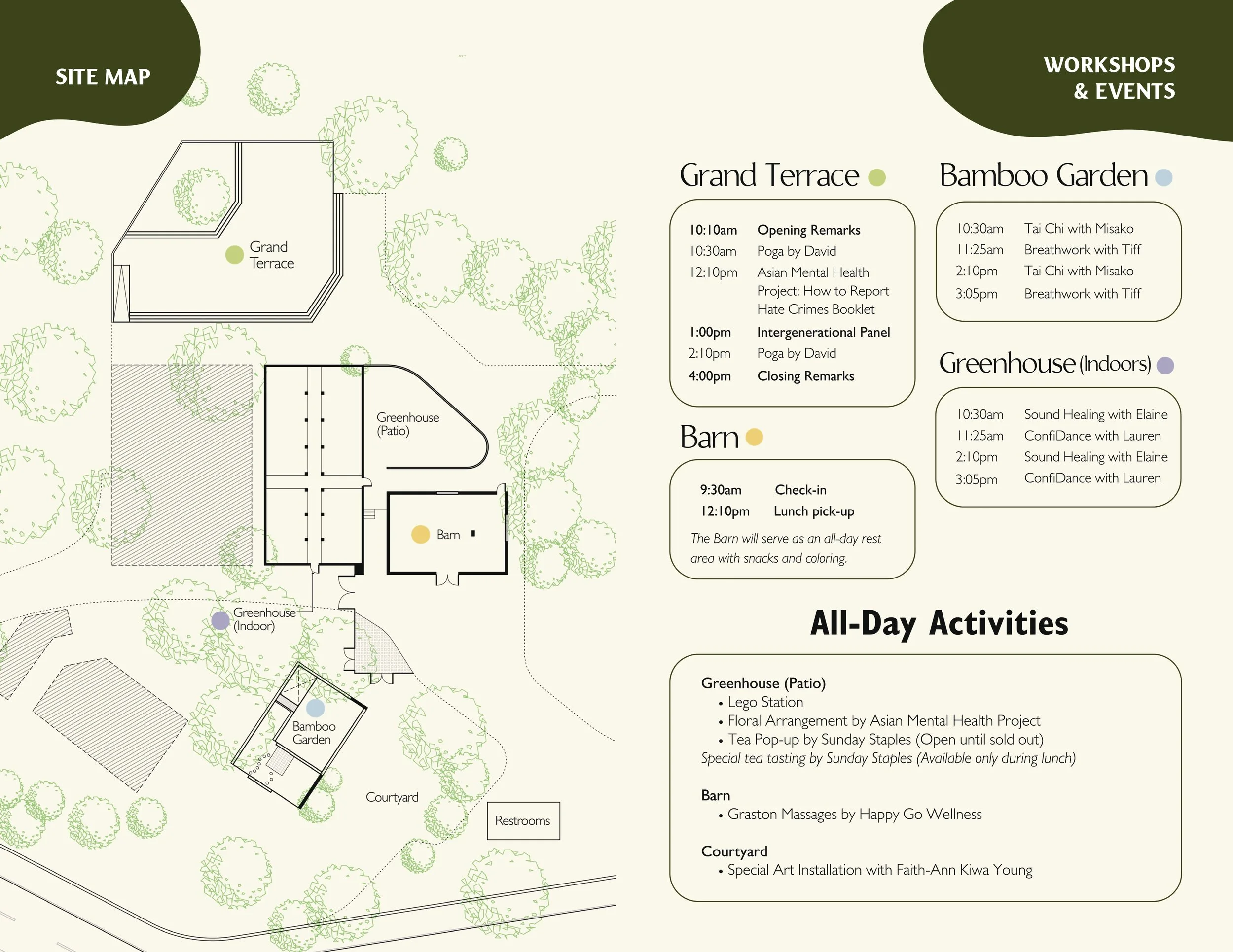 As some of our workshops will involve movement, please bring comfortable clothing and wear closed-toed shoes/sneakers. Since it is an outdoor event, you may want to bring a light jacket.