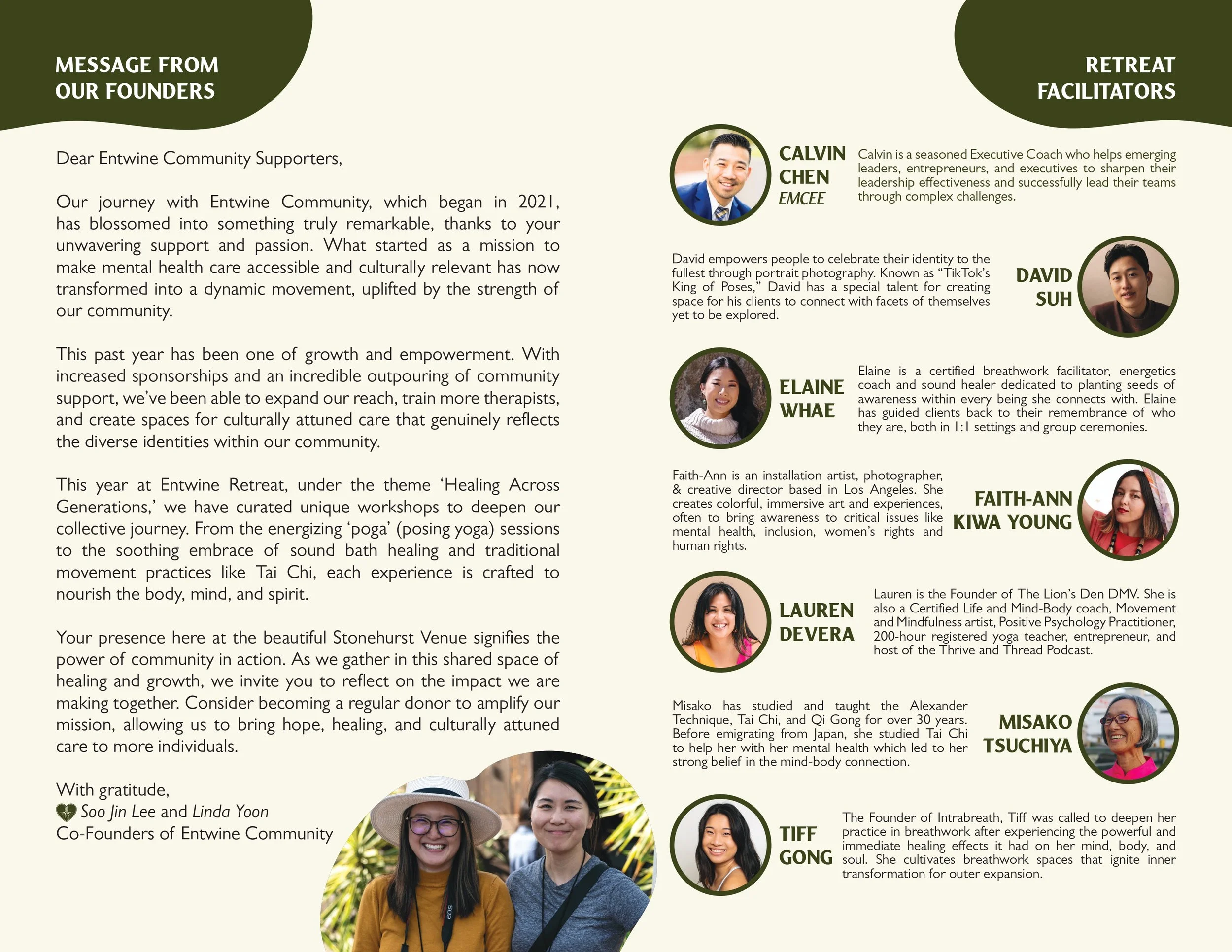 Thank you for joining us at The Stonehurst for our second Entwine Retreat, where we came together for a transformative experience that nurtured the mind, body, and spirit through the harmony of self and community care. Scroll down to discover the day's highlights and watch our 2024 recap video.